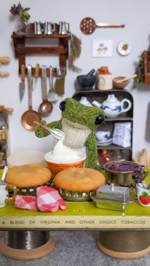 Te quiero mucho, ranita de punto que haces cosas como tomar el té, preparar pasteles o recoger moras. Froggy es una rana nacida de las manos y la imaginación de India Rose Crawford que promete relajación y que es la verdadera influencer de Instagram.