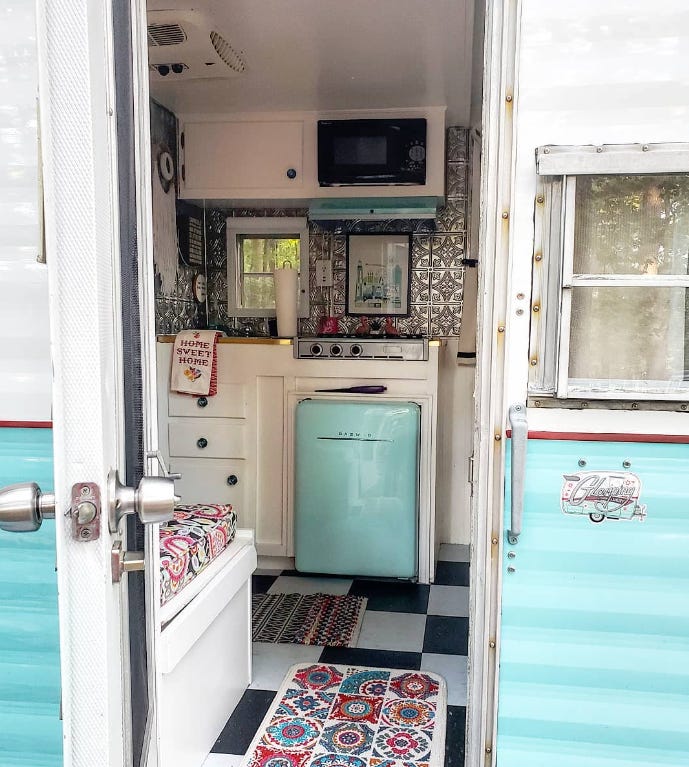 En la cocina en la que lavamos la lechuga hoy, lo mismo te podrían preparar una ensalada en Italia que freír unos San Jacobos camino de Francia. Es un rincón mínimo dentro de una caravana antigua. Podrían, si no fuera un alojamiento móvil que solo se alquila en Virginia Beach. Vaya por Dios.