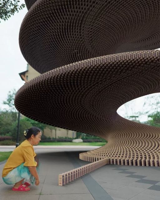 Las caídas de dominó nos suelen traer montajes espectaculares que nos hacen abrir la boca mientras nos preguntamos qué pasaría si una pieza se hace la remolona y corta el paso a las demás. Esta que publica Earthalant es tan espectacular como sospechosa de tener detrás algún montaje o una IA haciendo sus cositas –los pies de la señora y su increíble tranquilidad ante semejante desplome no son de este mundo– pero no puedo dejar de mirarla.