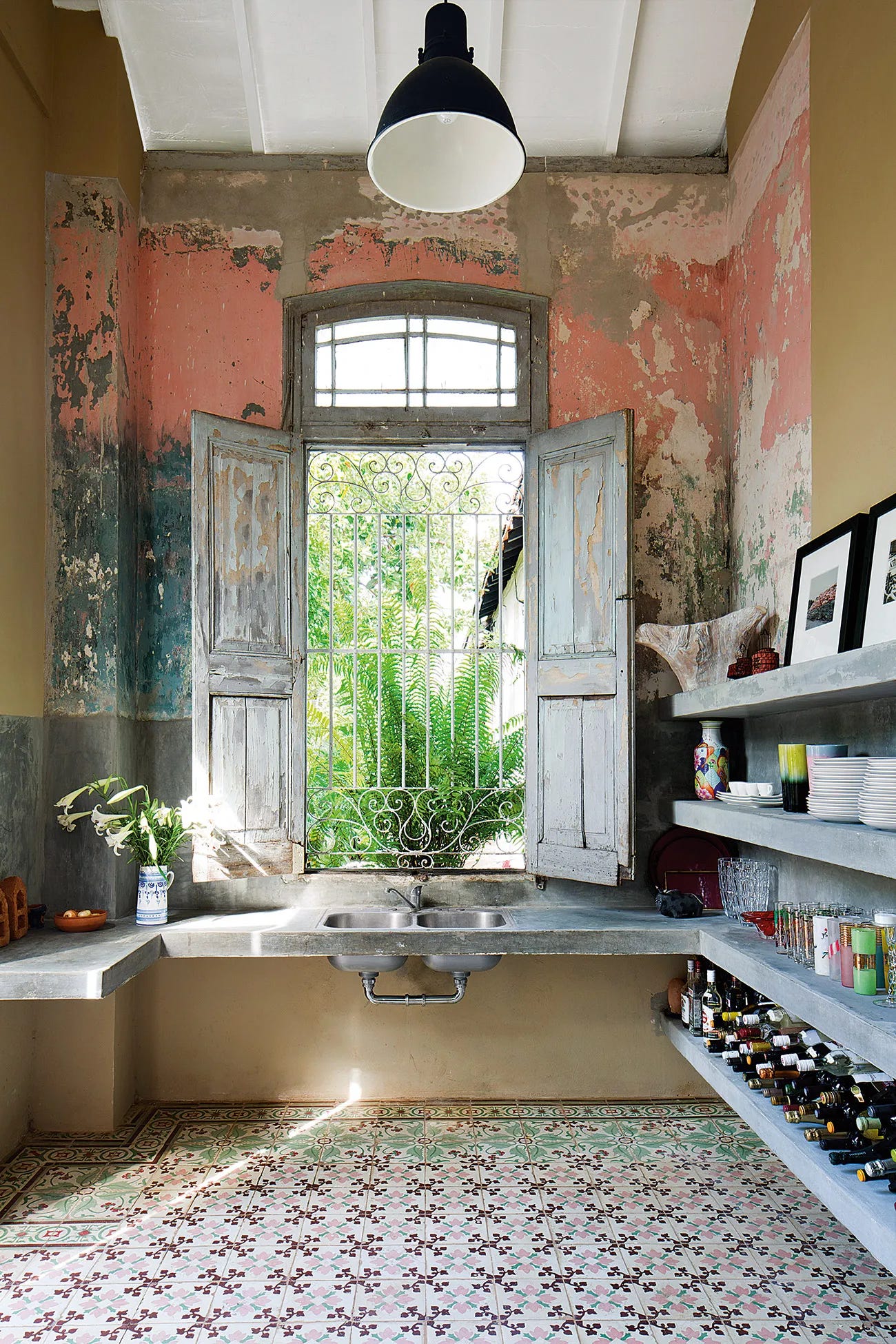 La paleta de colores la forman las distintas capas de pintura desconchada. Obra del tiempo, pero podría ser un diseño pensado para gustar. La encimera y los estantes son austeros y rotundos, hechos de hormigón, con un fregadero humilde de metal encastrado que parece formar parte de un cuadro.