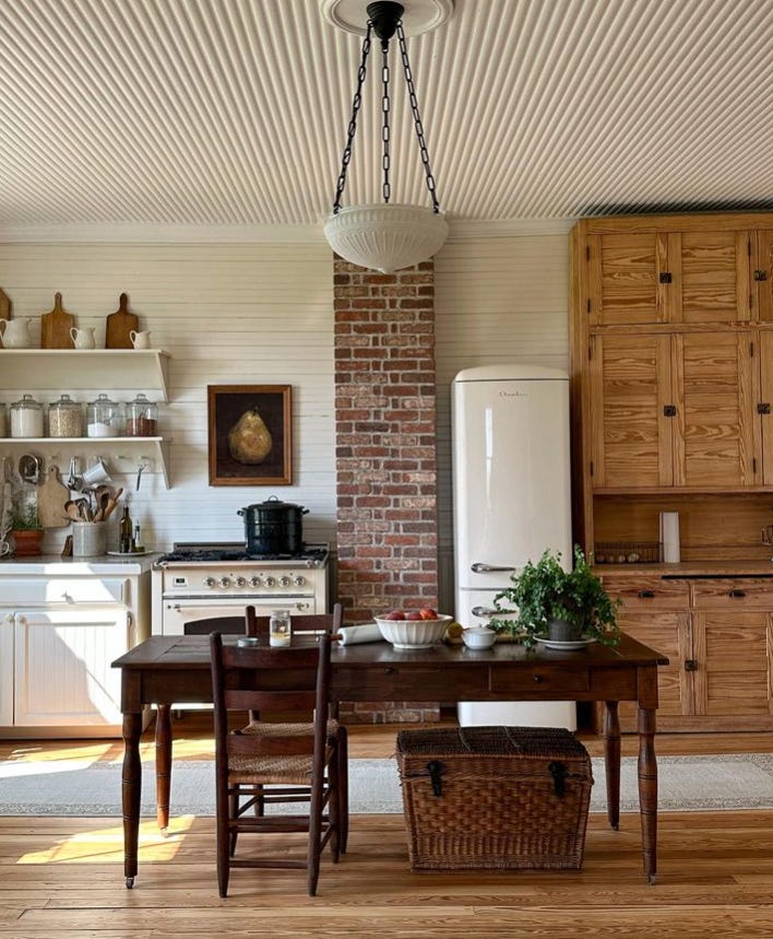 Junto al frigorífico vemos un mueble de madera que fue rescatado por un buscador de tesoros antiguos. Estaba pintado en color amarillo y con marcas y craquelados en la pintura que la dueña decidió eliminar por completo. Aquí puedes ver todo el proceso que siguieron hasta conseguir dejar la madera natural a la vista.
