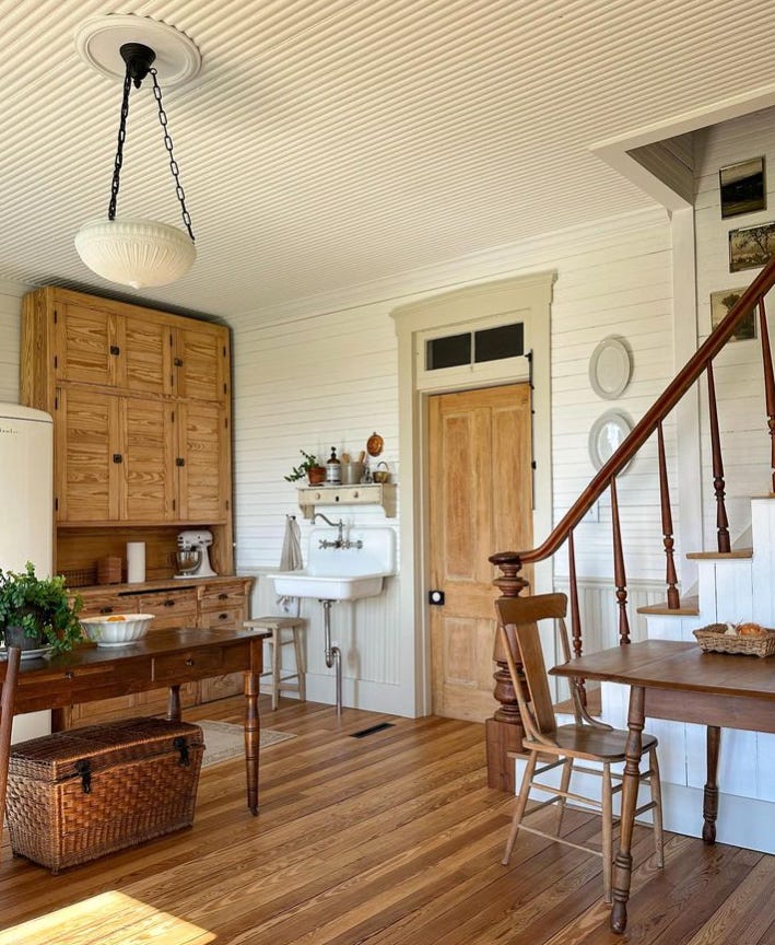 Las paredes se revistieron con lamas de madera hace un tiempo, y se pintaron en color crudo, igual que el techo. Este sí es original de la casa, una disposición poco común y algo desasosegante con tanta línea recta junta.