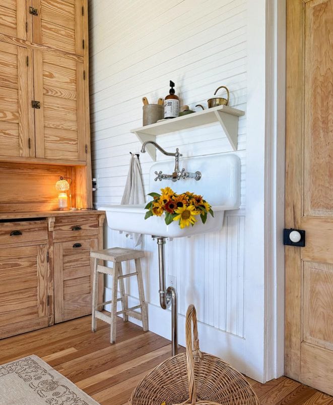 Después de echar un vistazo al techo y descubrir una bonita lámpara colgante, nos damos de morros con la realidad: el fregadero que languidece solitario apoyado en la pared.