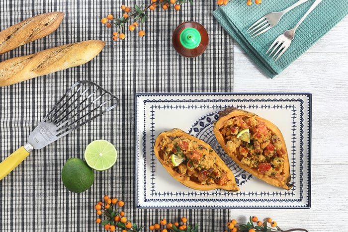 Hemos cocinado unas batatas rellenas de garbanzos con tomate crudo y lima. Un plato vegetal a base de batata y garbanzos, apto para dietas veganas, que se siente cómodo en todas las mesas.