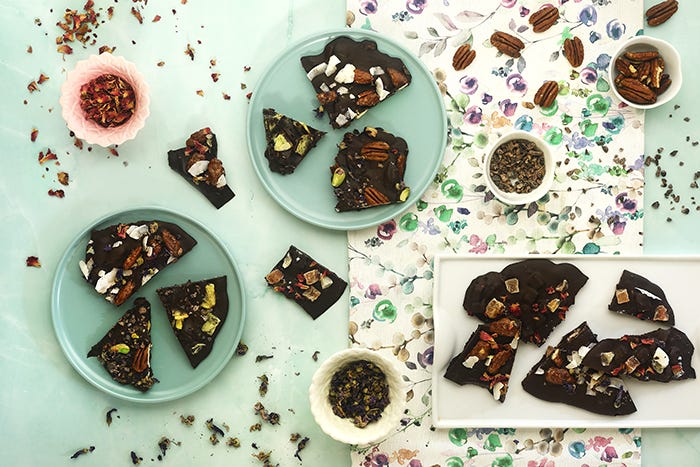 Doble placer: el de hacer estas placas de chocolate con cosas con tu familia o quien se apunte, y el de comerlas descubriendo puntitos de sabor dulces y salados que se funden con el chocolate.