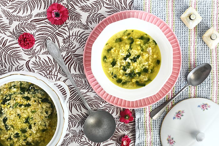 Sopa de pollo, huevo y maíz. Una sopa asada ottolenghiana, reconstituyente y muy sabrosa. No le falta un perejil para brillar en tu mesa. Para tener de fondo de armario recetero en otoño e invierno.