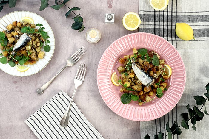 Esta semana hemos puesto en nuestra mesa unas migas con sardinas. Un plato refrescante y sencillo, ideal como plato principal o para servir como tapa.