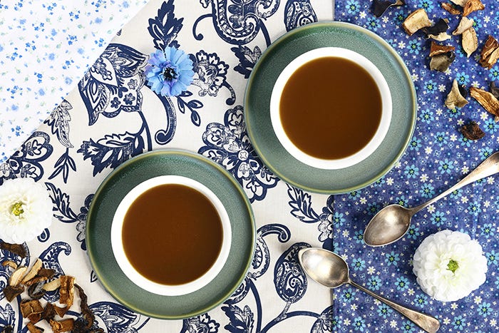 El último consomé de este otoño es un caldo umami de setas deshidratadas. En caldo un tanto pijoteras con ingredientes muy particulares, lleno de sabor y sustancia.