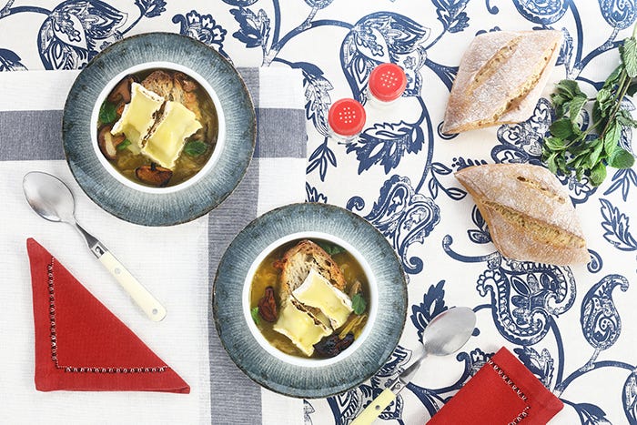 Esta semana hemos dado trabajo a las cucharas con una sopa de cebolla y setas que se hace casi sin darte cuenta. Es una actualización otoñal del clásico plato francés. Con setas, queso camembert y menta.