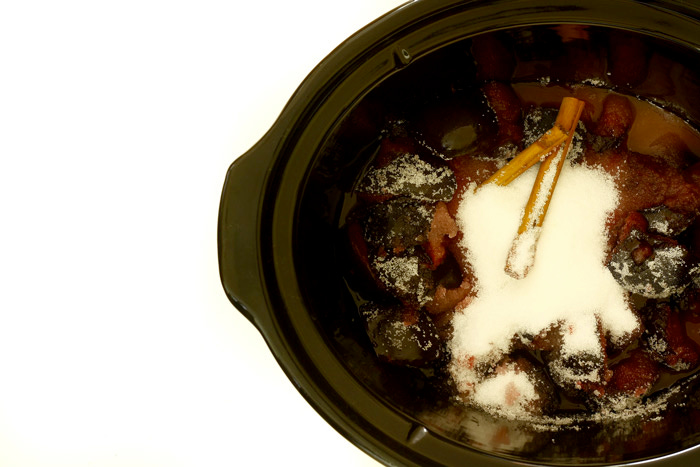 Lava las ciruelas, sécalas y pártelas en dos para extraer el hueso. Deshecha los huesos y pon la carne de ciruela en el slow cooker.