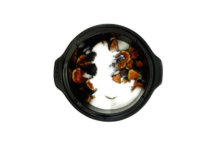 Lava los higos y quítales el rabito. Trocéalos y ponlos en el recipiente del slow cooker junto con el azúcar y la canela (o la vainilla o el anís).