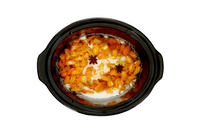 Hacer mermeladas en slow cooker es una gozada: puedes desatender la cocción durante un tiempo, eliminas el riesgo de que se quemen, y quedan estupendas a nada que domines la técnica. Esta técnica, en realidad, son solo unas pocas recomendaciones que pasan por no añadir menos de la mitad del peso de la fruta en azúcar –para asegurar una buena conservación– y dejar reducir con la tapa entreabierta en la fase final, tras haber triturado ligeramente la fruta cocinada y su jarabe.