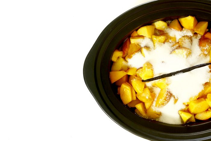 Coloca la fruta en el recipiente del slow cooker con el azúcar y el zumo de limón.
