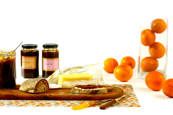 Este año me estoy atiborrando a zumo, me encanta la combinación de dulzor y acidez, y he decidido disfrutarlas durante más tiempo en forma de mermelada. También me he dedicado durante unos días a secar la piel y laminarla para utilizar la piel seca en postres y otras preparaciones.