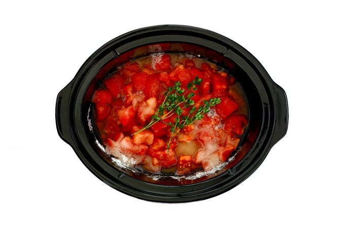 Cocina en ALTA durante 5 horas. Pasado ese tiempo, elimina el tomillo y tritura el tomate con el brazo de la batidora dentro del slow cooker.