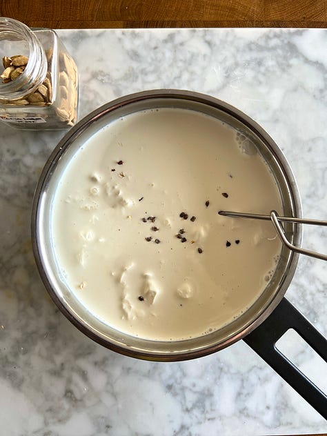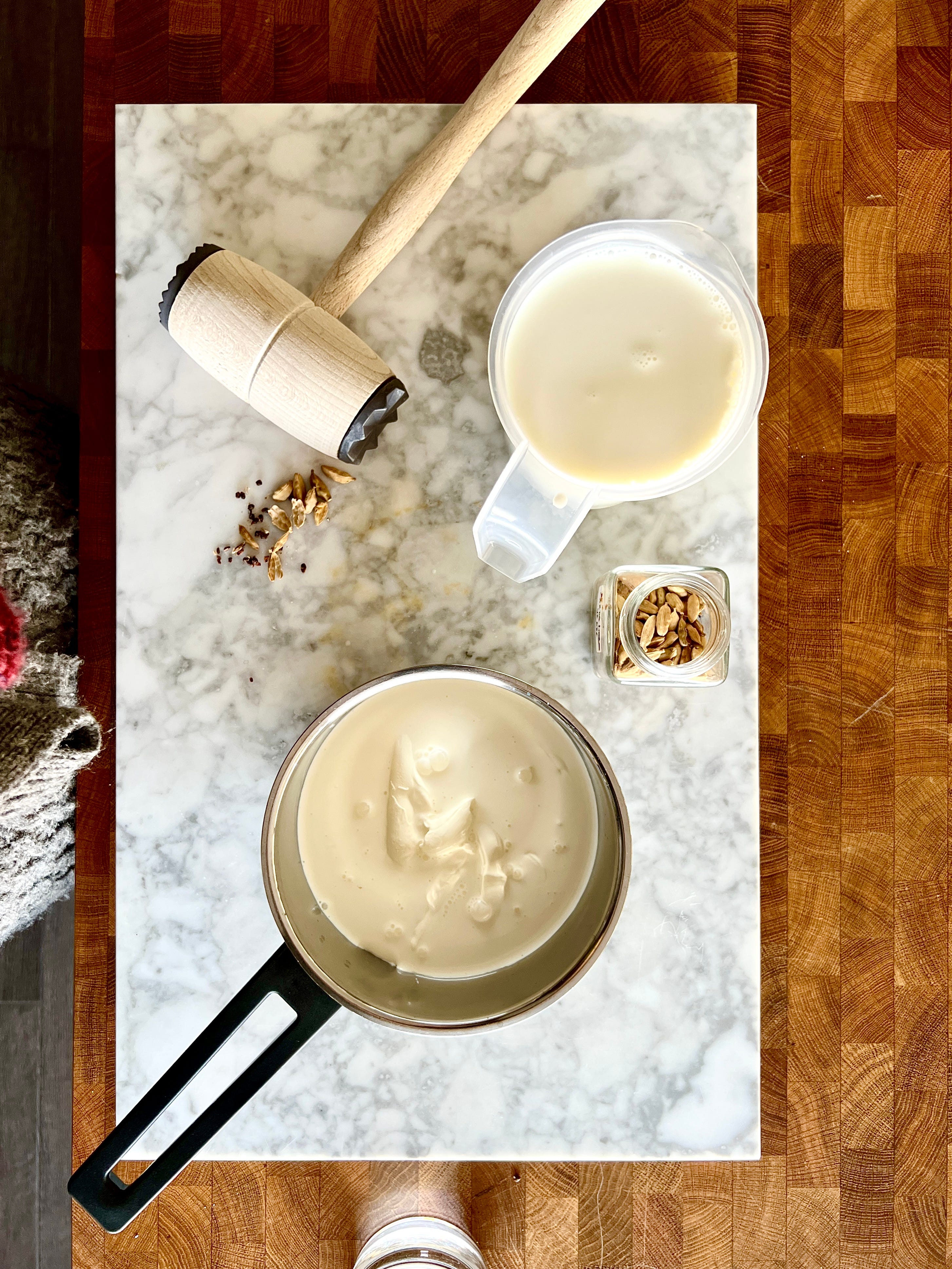 Añade las semillas de cardamomo al cazo. Calienta a fuego suave, con cuidado de que no hierva para que no rebase el cazo.