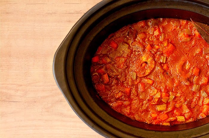 Es importante que la carne esté totalmente cubierta por la mezcla de verduras, salsa de tomate y vino blanco, de lo contrario la carne que quede sin cubrir saldrá seca y menos melosa que la que está cubierta.