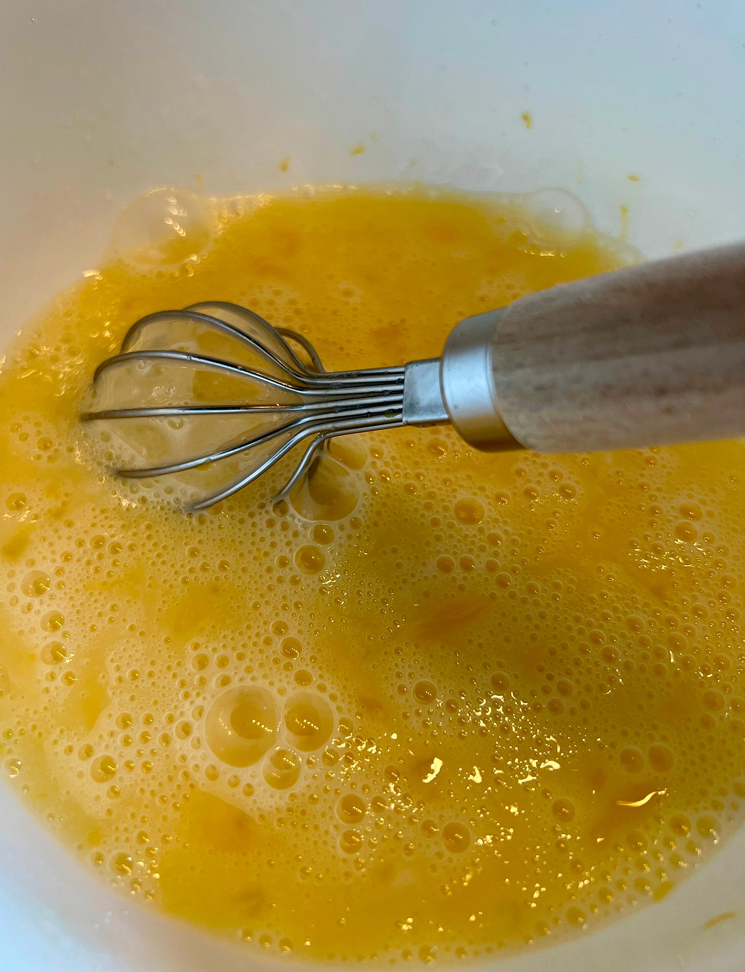 Bate los huevos a mano y con poca fuerza con el azúcar y la ralladura del limón. No hace falta levantar los huevos, solo que se mezclen. Queremos evitar que luego salgan ojos en el cuajado.