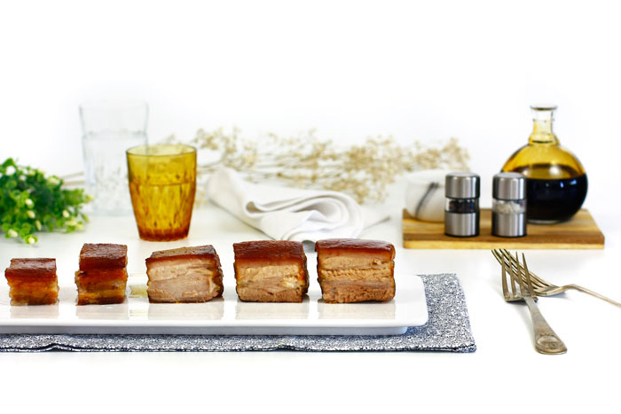 Para el paso por la plancha, he usado un truco de Íñigo Aguirre –el mago de Umami Madrid– que funciona muy bien y ayuda a que la panceta no se pegue en la plancha. Si dudas de que tu sartén o plancha sean todo lo antiadherentes que debieran, pon un trozo de papel de horno entre la pieza y la superficie de la plancha. ¡Funciona!