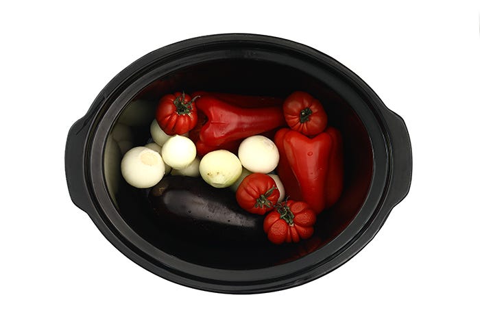 Lava los tomates, los pimientos y las berenjenas, sécalos y ponlos en el slow cooker.