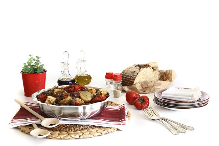 Que nadie se eche las manos a la cabeza. La auténtica panzanella –una receta italiana originaria de La Toscana– tiene como ingredientes principales el tomate fresco y el pan. Lo sé, lo sé, pero no he podido evitar hacer esta versión con hortalizas asadas –tomate, cebollitas, pimientos rojos y berenjenas– aprovechando todo el sabor de los jugos de cocción para hacer una vinagreta que empape el pan y lo convierta en un goce veraniego y glotón.