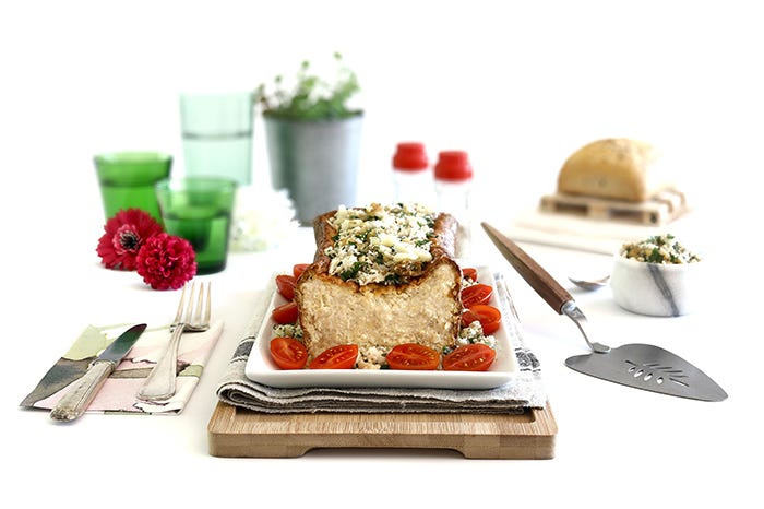 A la hora de servir, desmolda y cubre el pastel con la picada de perejil y queso.