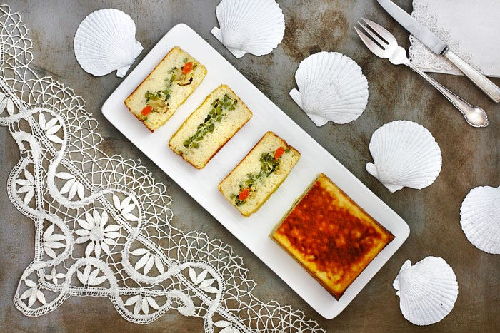 Evita sobrecocinar el pastel de dorada y vieiras: estará hecho cuando al tocar la superficie aparezca cuajada y esponjosa y, al traspasar con una brocheta, esta salga limpia.
