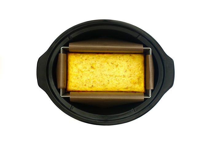 Coloca el molde en el slow cooker, pon un paño debajo de la tapa y cocina entre 60 y 90 minutos o hasta que el pastel quede cuajado.