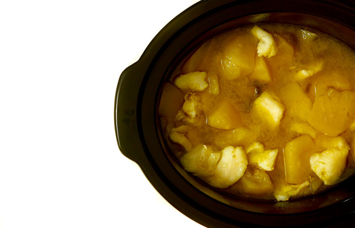 Vacía el contenido de la sartén en el slow cooker, añade las patatas troceadas, un poco de sal y pimienta blanca recién molida. Añade agua sin que llegue a cubrir las patatas por completo.
