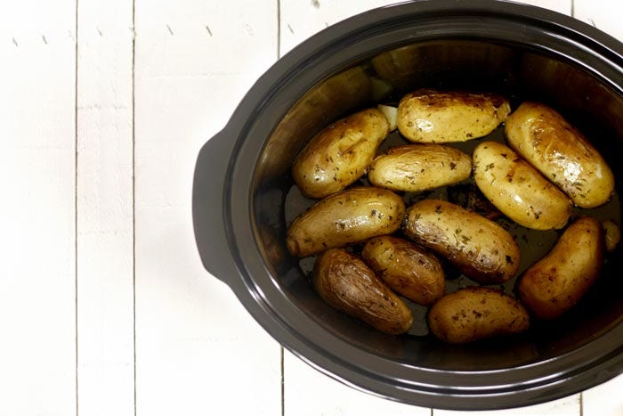 Vuelca la sartén en el slow cooker y cocina las patatas rellenas de salchichas durante 3 horas en ALTA.