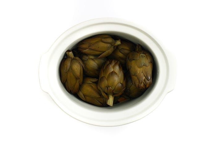 Coloca las alcachofas enteras en el slow cooker. Si no te caben todas, corta la punta de las hojas.