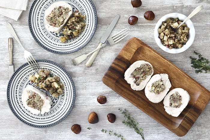 Pechuga de pavo rellena de pera y castañas