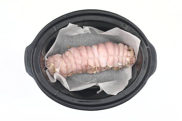 La pechuga de pavo es estupenda para hacer grandes piezas de rellenos. Es sabrosa pero lo bastante neutra para no interferir; es tierna y mucho más económica que una pieza entera de pularda, y no hay que entretenerse deshuesando. Basta con que en la pollería te la abran para rellenar, formando una pieza plana y extendida, y podrás añadir el relleno escogido, bridar el rollo para que no se abra y cocinarlo en tu slow cooker.