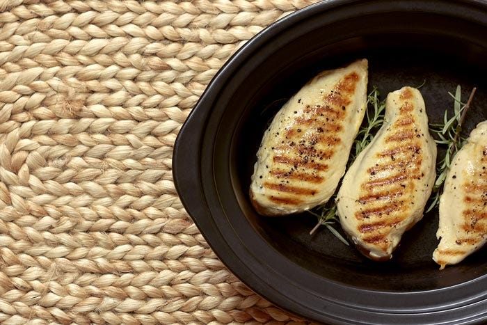 Coloca las ramas de tomillo y romero en el fondo de la olla. Coloca encima las pechugas de pollo, pon la tapa y cocina durante 1 hora en ALTA.