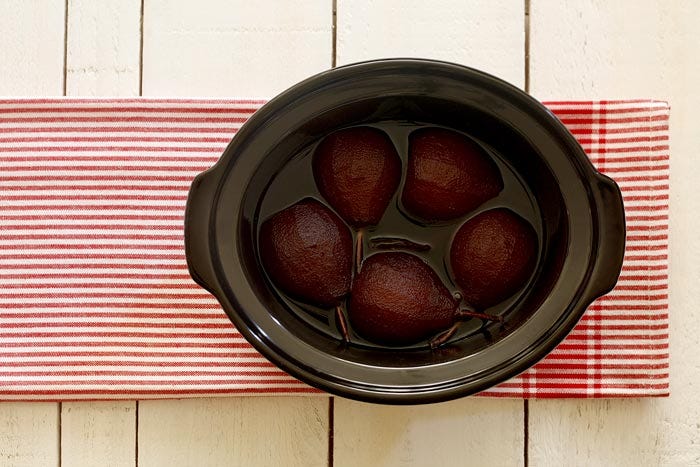 Es precisamente por esto por lo que las peras al vino agradecen el fuego lento y controlado de la crock pot, ya que no hay posibilidad de que se pasen y queden hechas puré, a no ser que dejes la olla encendida y te vayas al Annapurna a confitar jengibre.