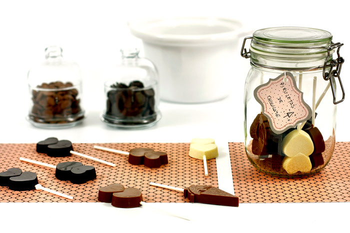 Vierte pequeñas porciones de chocolate fundido en los moldes de piruletas y coloca el palito. Deja reposar durante varias horas en un lugar fresco y sobre una superficie bien nivelada.