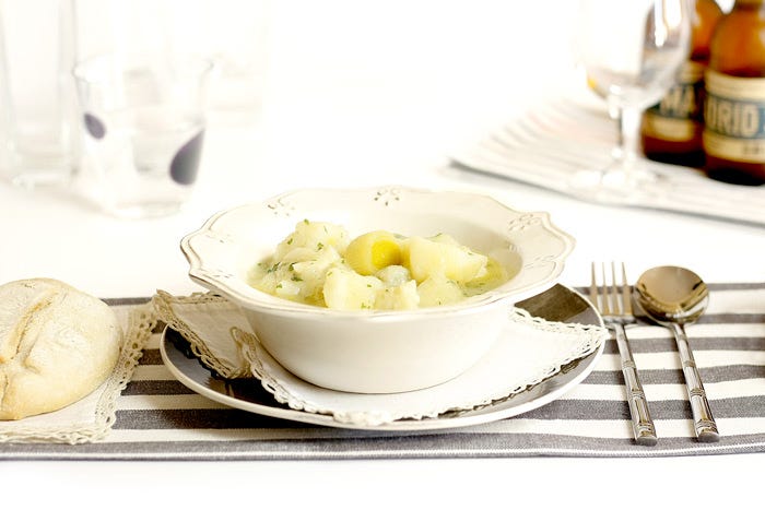 Siguiendo con la cocción en dos tiempos habitual de los guisos de pescado cocinados en slow cooker, para hacer esta porrusalda de bacalao aplicamos una cocción larga a las patatas, los puerros y la cebolla, añadiendo el pescado al final, que se hará con el calor residual.