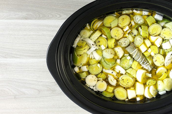 Coloca las patatas, la cebolla y el puerro en el slow cooker con un poco de sal, dos cucharadas soperas de aceite de oliva virgen extra, el bouquet garní y pimienta negra molida. Cubre con agua y remueve para que las patatas queden en el fondo.