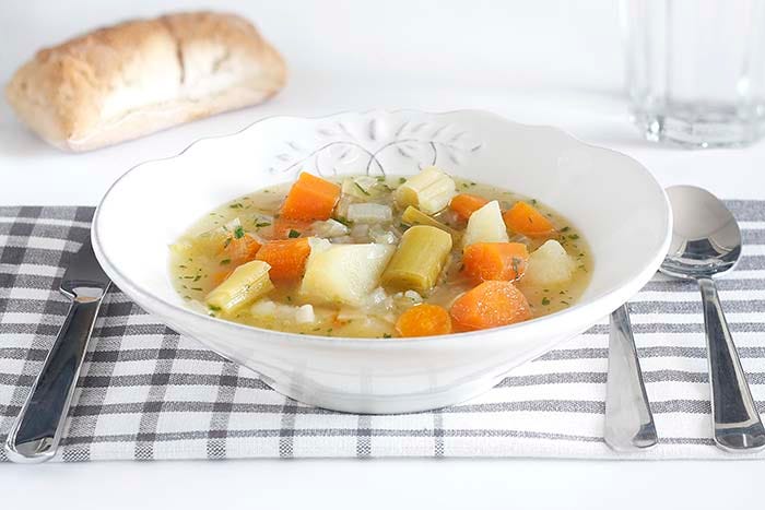 Para elaborar la porrusalda se recomienda utilizar caldo de verduras, pero si no lo tienes a mano, puedes utilizar agua. También, como se apunta en la receta, puedes usar un caldo de ave suave.