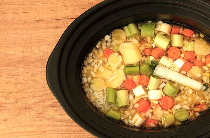 Coloca las hortalizas troceadas, el bouquet garní y el caldo en el slow cooker junto a 75ml de aceite de oliva virgen.