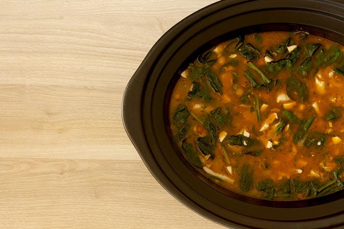 Una vez cocidos los garbanzos, agrega las espinacas a la olla caliente, tapa y deja que se cocinen durante 30 minutos en ALTA.