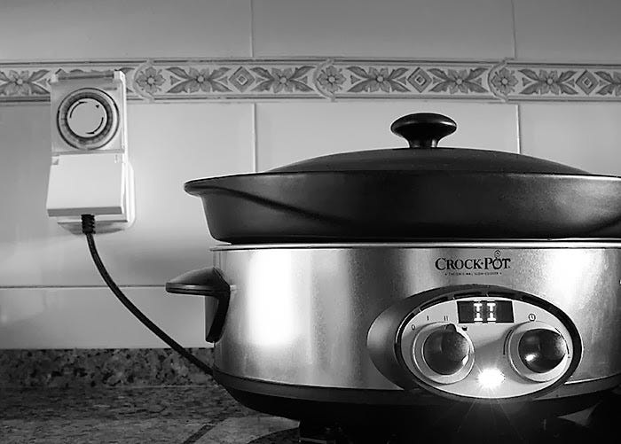 Si quieres tener más margen con los tiempos o apagar por completo la olla al terminar la cocción, hazte con temporizador de enchufe de los que se colocan en el enchufe. No hace falta que sea sofisticado, los que mejor resultado dan son los manuales, de pestañas. Te ayudará a controlar los tiempos, tanto en el inicio (si tu olla no es digital) como en el final de la cocción.