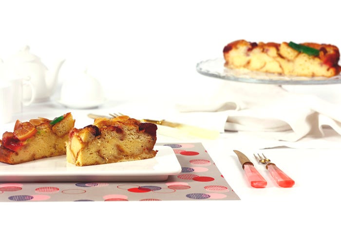 La textura que debe de tener el pudin de roscón de Reyes es húmeda, jugosa y tierna. Tenlo en cuenta a la hora de comprobar el punto de cocción.