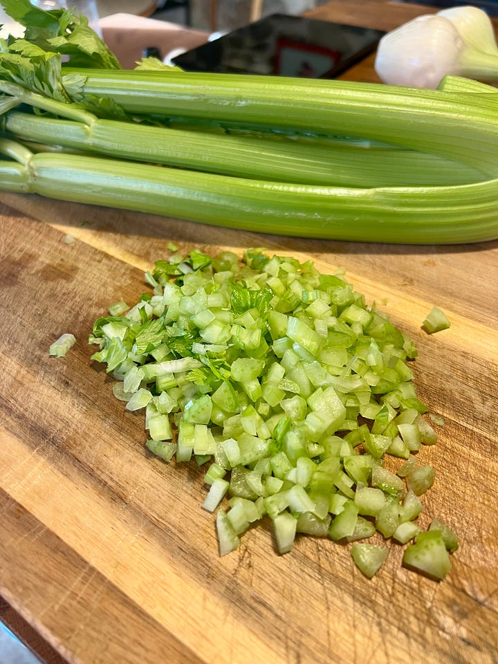 Incorpora los ajetes y el apio y sigue salteando durante unos minutos hasta que dejen de estar crudos.