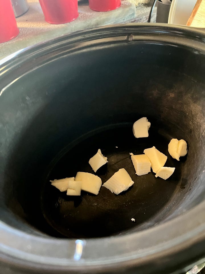 Pon 40 g de mantequilla cortada en dados y una cucharadita de postre de aceite en el slow cooker.