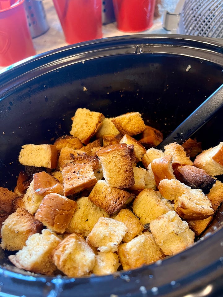 Añade el pan y una cucharada de salvia picada. Cocina en ALTA durante 2 horas, removiendo de vez en cuando para que el pan se tueste por igual.