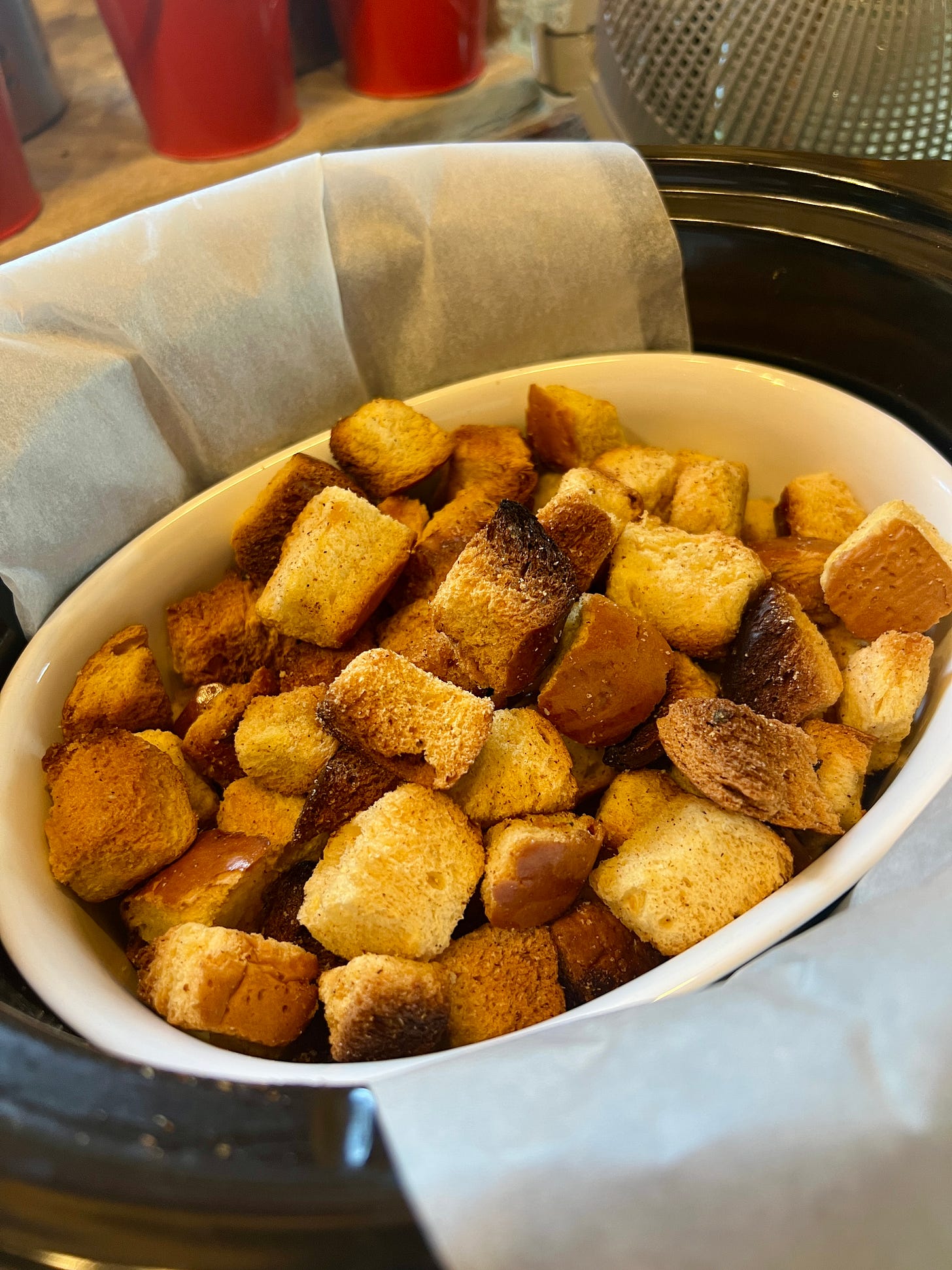 Cuando esté listo, saca el pan y ponlo en el molde, pero no apagues la olla lenta: deja que siga calentando en ALTA y limpia ligeramente el fondo y las paredes del recipiente con papel de cocina.