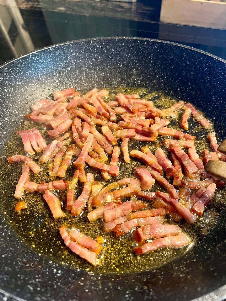 Calienta una sartén con el resto de la mantequilla y un chorro pequeño de aceite de oliva. Saltea el bacon hasta que esté ligeramente dorado.
