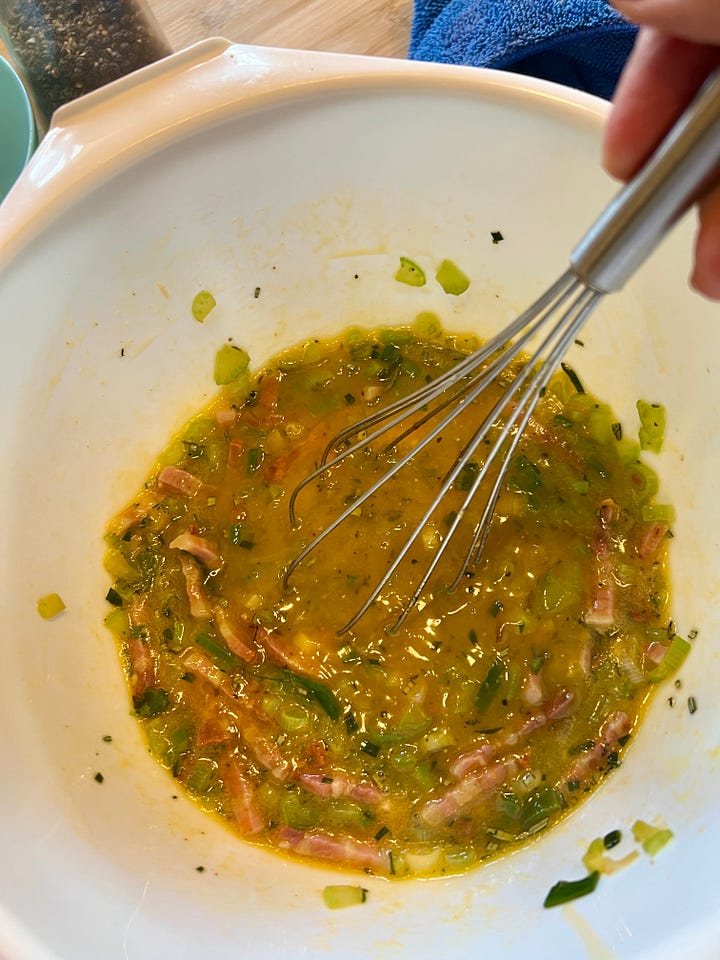 Mientras se pelean y se ponen de acuerdo, nosotros vamos a lo mollar: la comida rica. Y por eso vamos a preparar un relleno que no rellena y es más bien un pudin salado de pan y hortalizas.