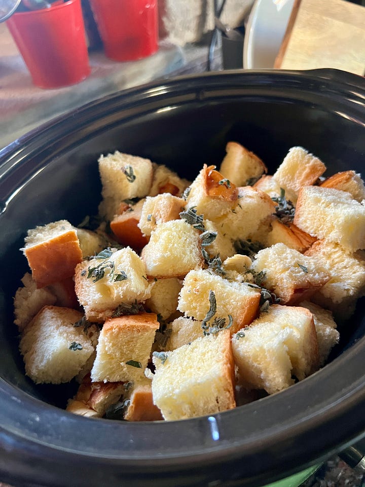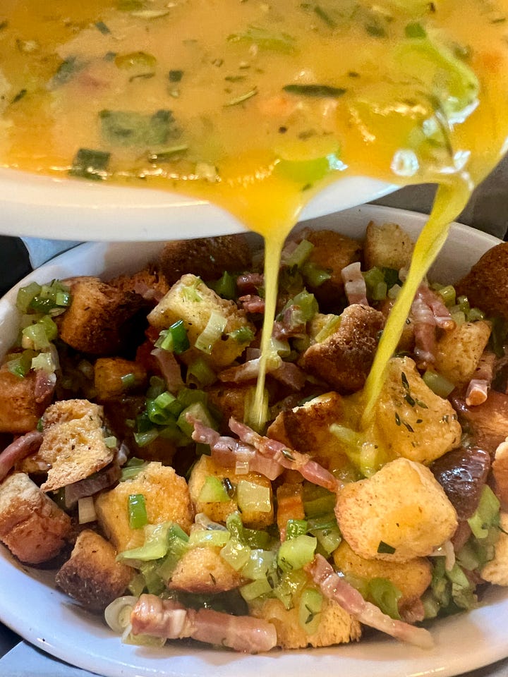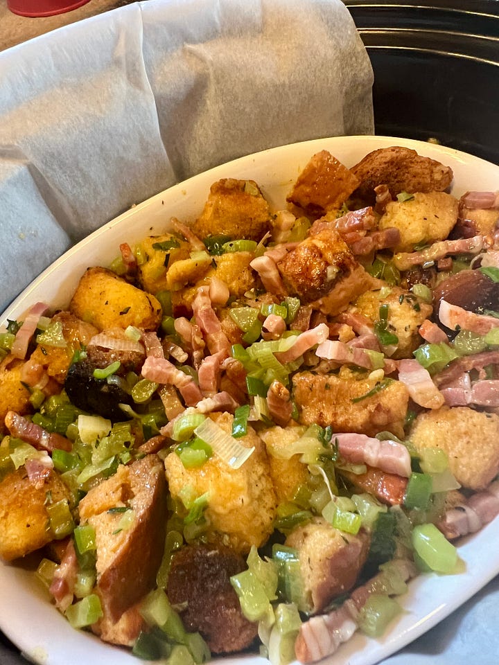 Es el stuffing, que quiere decir relleno, y que trae de cabeza a los estudiosos de la cosa: los hay como yo, que no conciben que algo que no rellena nada se llame relleno, y los que diferencian entre stuffing, cuando se cocina dentro del pavo, y dressing, cuando se hace aparte en el horno.